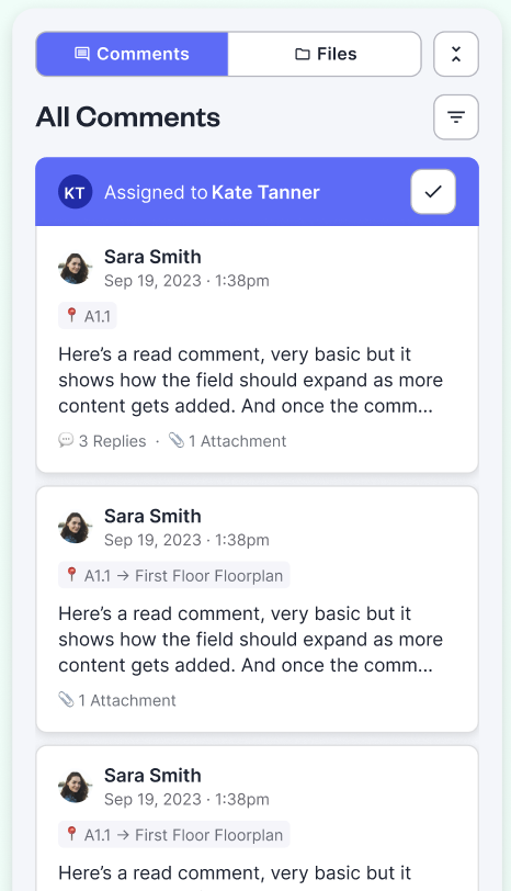 You may notice that we have released an update to the comment pane, which is in response to feedback from our Digs Community. This update includes a simple way to view comments and tasks. You can now see the location of the comment, such as the page number and section of the blueprint, as well as the number of attachments and replies. Simply tap the comment, and we will take you directly to the location to provide full context of the conversation.