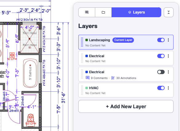 Easily collaborate with trades (electrician, plumbing, low voltage) by creating layers to comment, annotate, markup, and communicate changes.