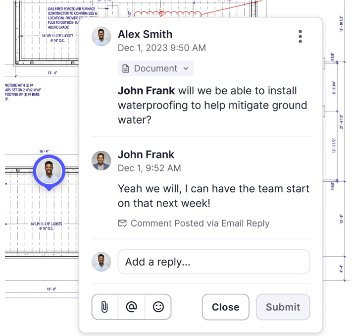 Whether collaborating in the office, on a job site or on the go, you can quickly and easily respond to comments by replying to the email notification. No need to log into Digs for for a quick update or response, simply respond to the email from your favorite email client.