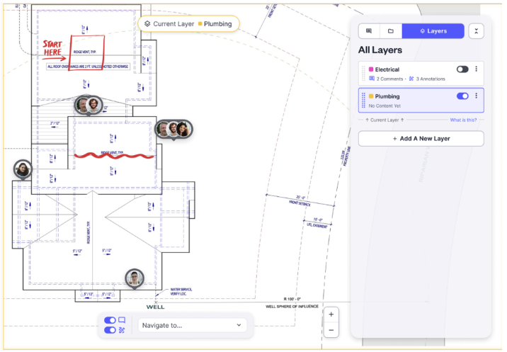 Easily collaborate with trades (electrician, plumbing, low voltage) by creating layers to comment, annotate, markup, and communicate changes. Layers can be isolated or turned on allowing the ability to view multiple layers at one time by overlaying markups.